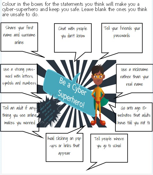 Colour the box activity to help children identify safe and unsafe ways of using the internet.