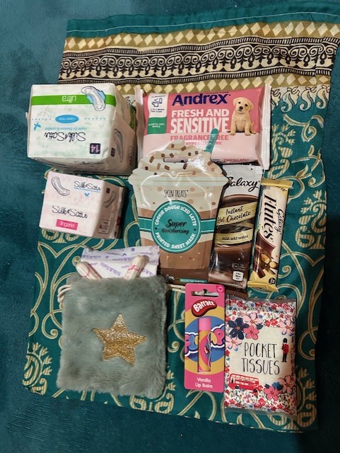 Drawstring bag contains period product pouch, period pads and tampons, pantyliners, tissues, lipbal, facial mask, hot chocolate and wafer flutes, wipes.