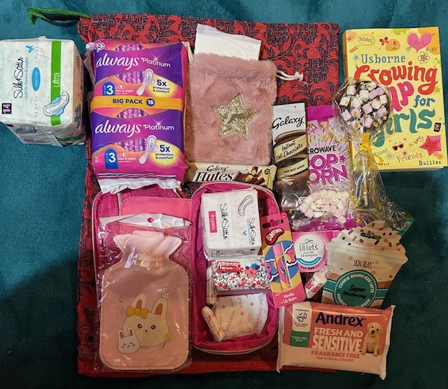 Kit includes pads, tampons, a period tracker chart, Usbourne Guide to Growing Up book, wipes, small mirror, facial mask, period pants, hand sanitiser, mini hot water bottle, hot chocolate sachet, popcorn, wafers, small pouch, lip balm and affirmation stickers.