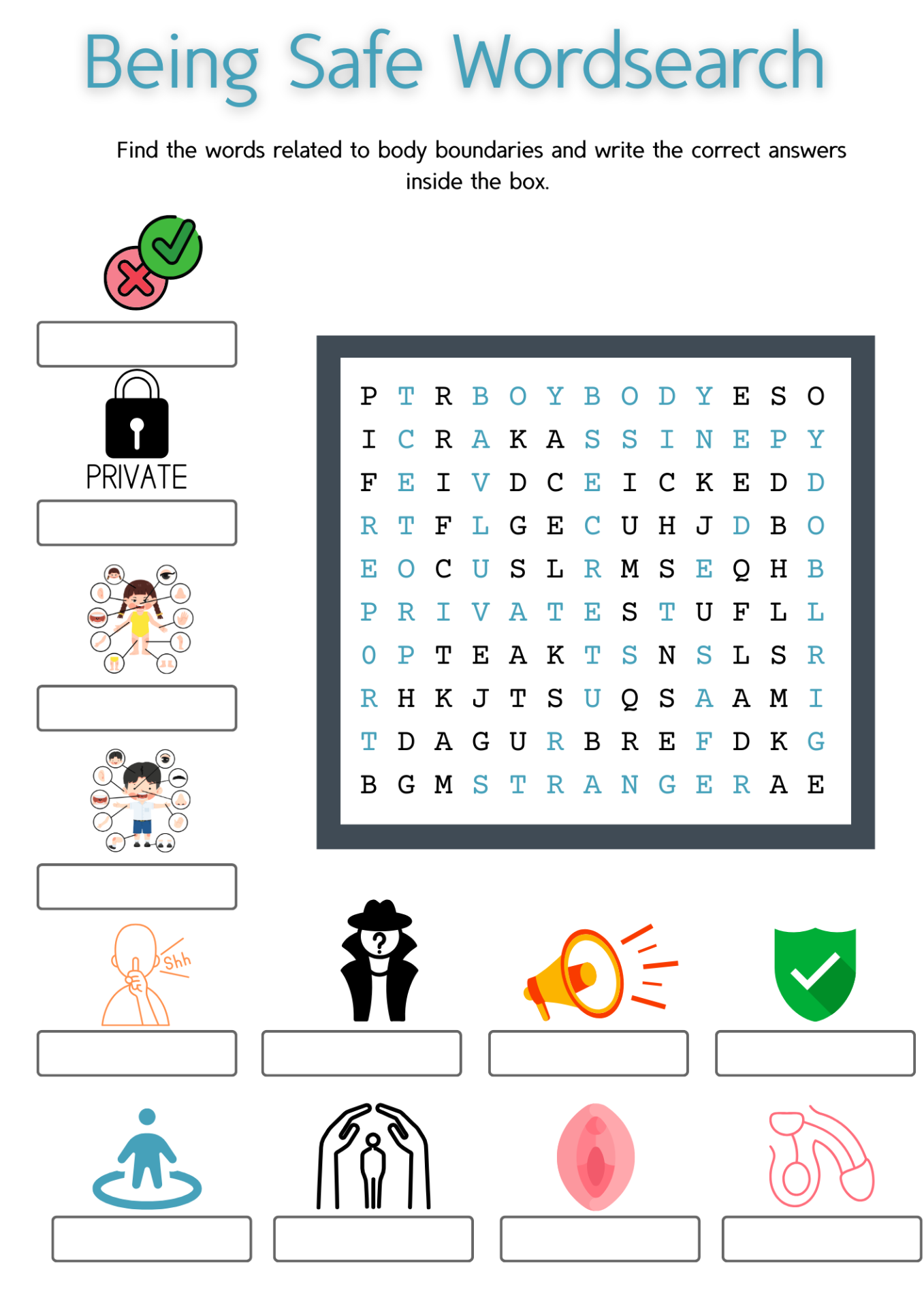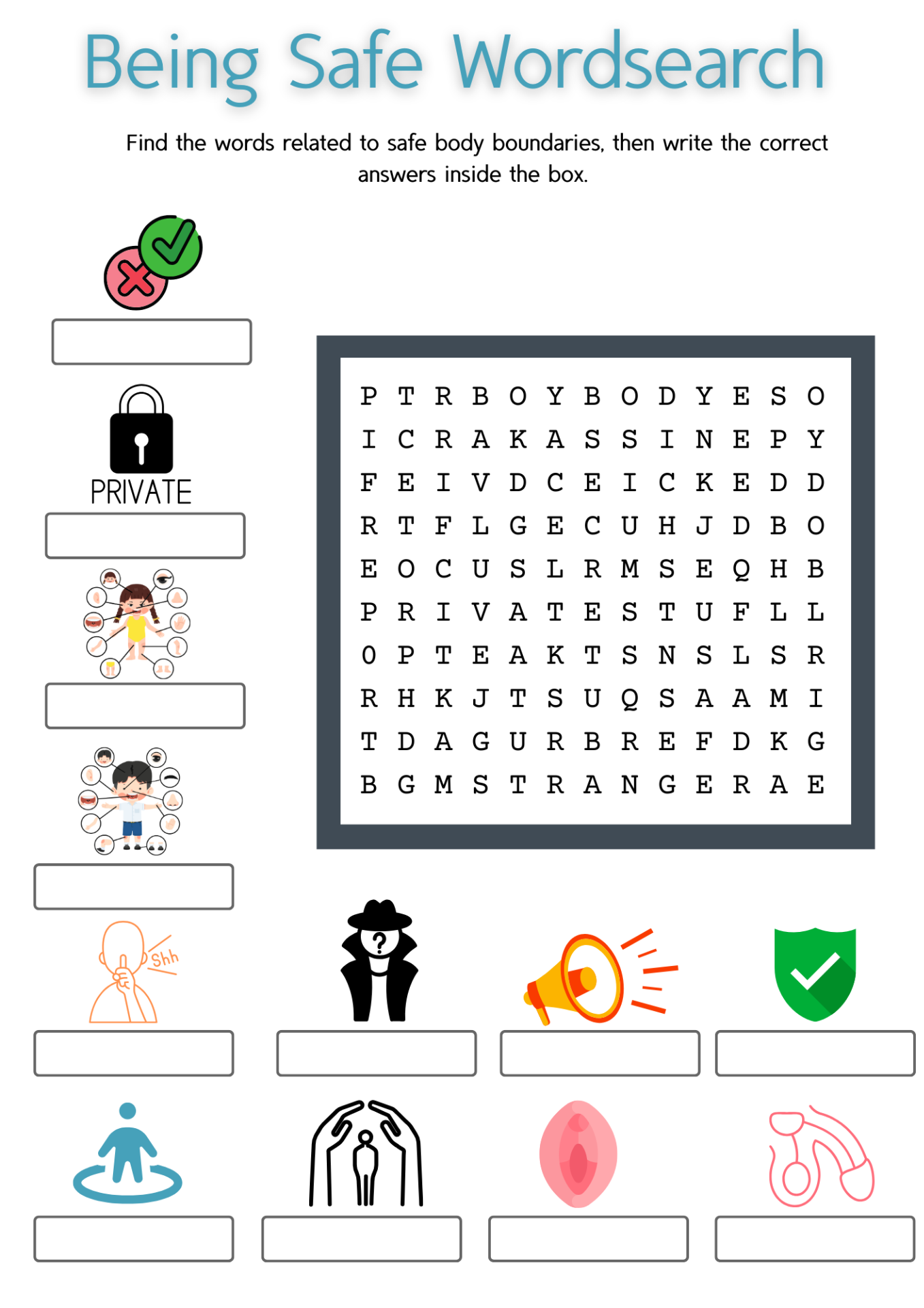 Simple wordsearch for conversations at home about body parts and online safety. Find the missing word for each image within the wordsearch.